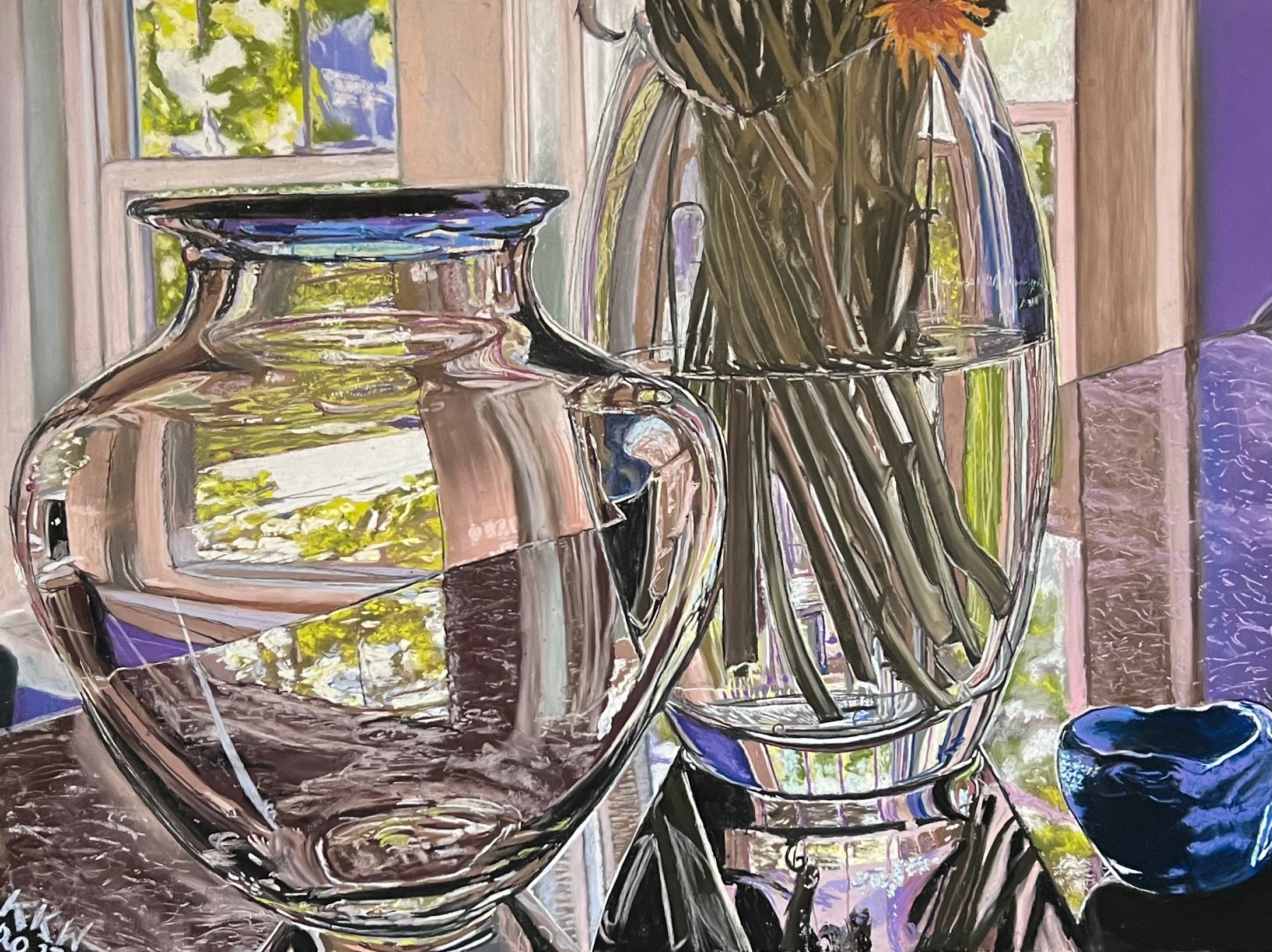 "Glass Vases", 2023, from still-life composed and photographed by the artist. Soft pastel on acid-free. premium-grade sanded pastel paper. Image: 22" x 16". Unframed . $2,000.00.